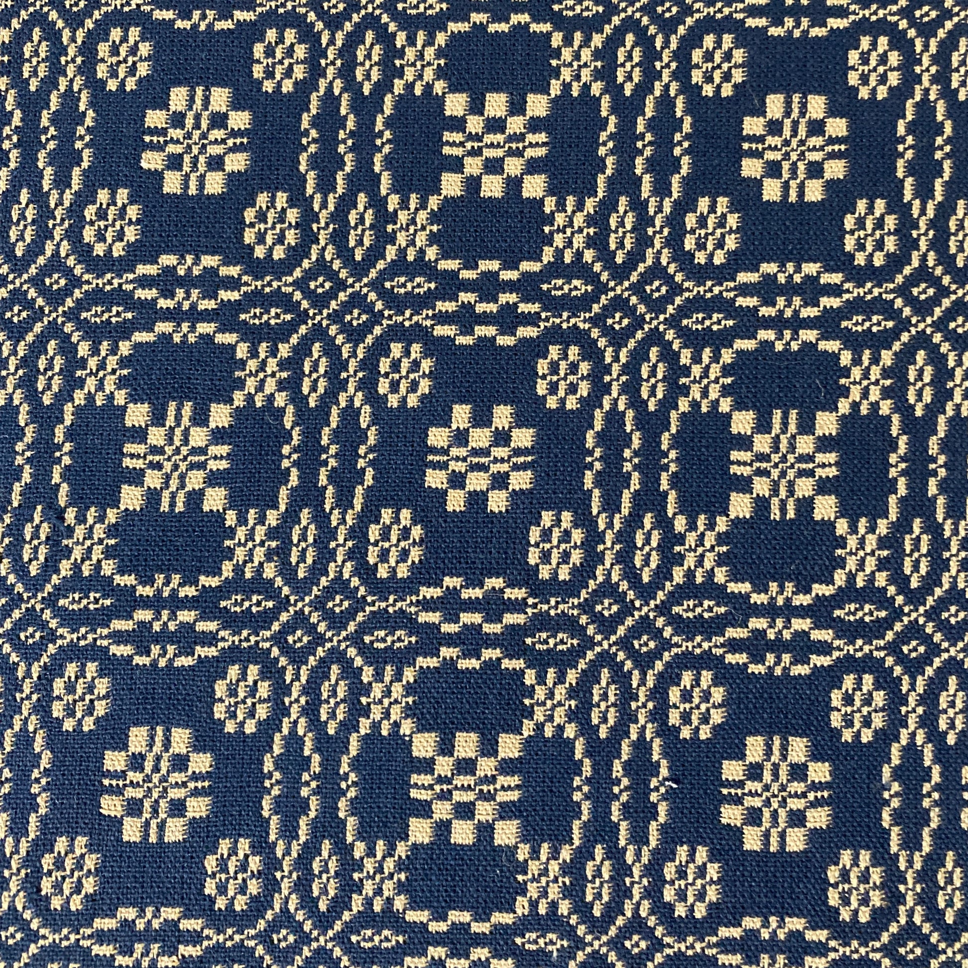 PRIMITIVE OVERSHOT COVERLET DESIGN CALLED "LOVERS KNOT" DOUBLE-WOVEN USING RECYCLED US COTTON YARN ON BDDW'S VINTAGE SHUTTLE LOOMS IN PENNSYLVANIA.