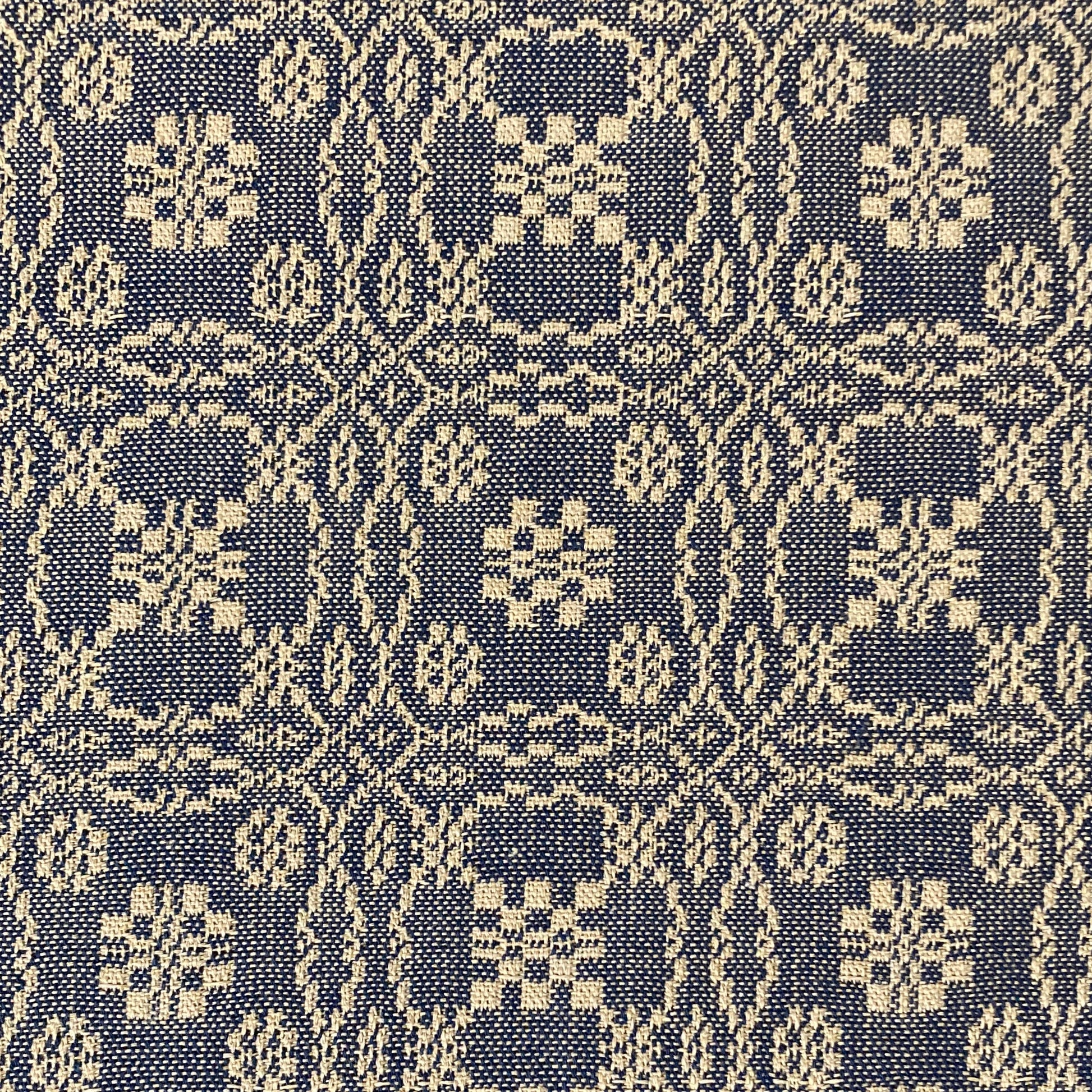 PRIMITIVE OVERSHOT COVERLET DESIGN CALLED "LOVERS KNOT" DOUBLE-WOVEN USING RECYCLED US COTTON YARN ON BDDW'S VINTAGE SHUTTLE LOOMS IN PENNSYLVANIA.